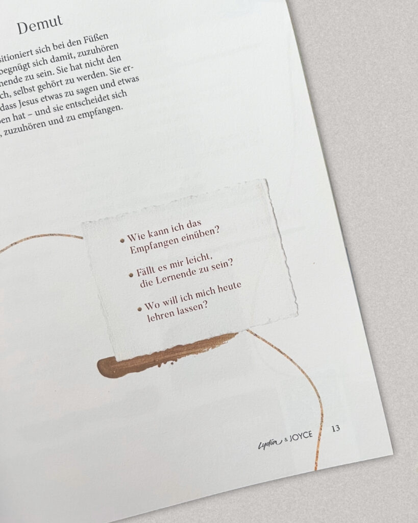 Tägliche Reflexionsfragen laden, tiefer zu graben und in die Stille vor Gott zu gehen. Das Heft bietet Platz, Gedanken festzuhalten.