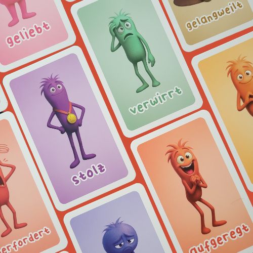 Auf der Vorderseite sind kreativ gestaltete bunte Figuren, die unterschiedliche Gefühle repräsentieren.
