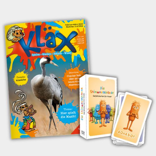 KLÄX ist die Zeitschrift mit Spaßfaktor für Kinder von 7 bis 12 Jahren. Die bunte Mischung aus Bibelgeschichten, Bastel-Tipps, Wissen und Comics regt zum Fragen und Kreativsein an. Magazin plus Gefühlskarten.