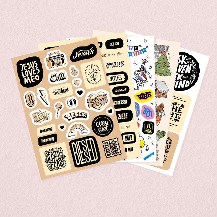Fünf Stickerbögen mit motivierenden Sprüchen, Bibelversen, Weihnachts- und Geburtstagsmotiven für Teens.